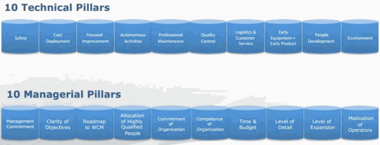L'implementazione del programma di ciascuno pilastro avviene secondo 7 step che portano l'azienda da uno stato Reattivo (si reagisce quando nasce un problema) ad uno Preventivo (utilizza le esperienze per evitare il ripetersi di problemi già verificatesi, incluso problemi simili in altre condizioni), per traguardare uno stato Proattivo (In accordo con l'analisi di rischio RiskAssessment, utilizza le appropriate azioni correttive per prevenire la possibilità che accada uno specifico problema). L'azienda tende a diventare un Benchmark. L’unica soluzione per far fronte a questo scenario, spesso è ripensare e non solo ritoccare, il proprio processo logistico - produttivo affinché sia snello, veloce e reattivo, quindi senza sprechi e assolutamente sotto controllo. Fattori primari di cambiamento all’origine della “rivoluzione lean” e del world class manufacturing sono: • la progressiva riduzione del ciclo di vita del prodotto;